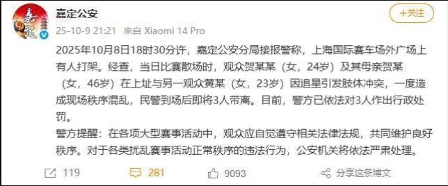 10月9日晚,上海嘉定公安分局发布通报:10月8日18时30分许,嘉定公安分局接报警称,上海国际赛车场外广场上有人打架。经查,当日比赛散场时,观众贺某某(女,24岁)及其母亲贺某(女,46岁)在上址与另一观众黄某(女,23岁)因追星引发肢体冲突,一度造成现场秩序混乱,民警到场后立即将3人带离。目前,警方已依法对3人作出行政处罚。(据10月10日光明网报道)